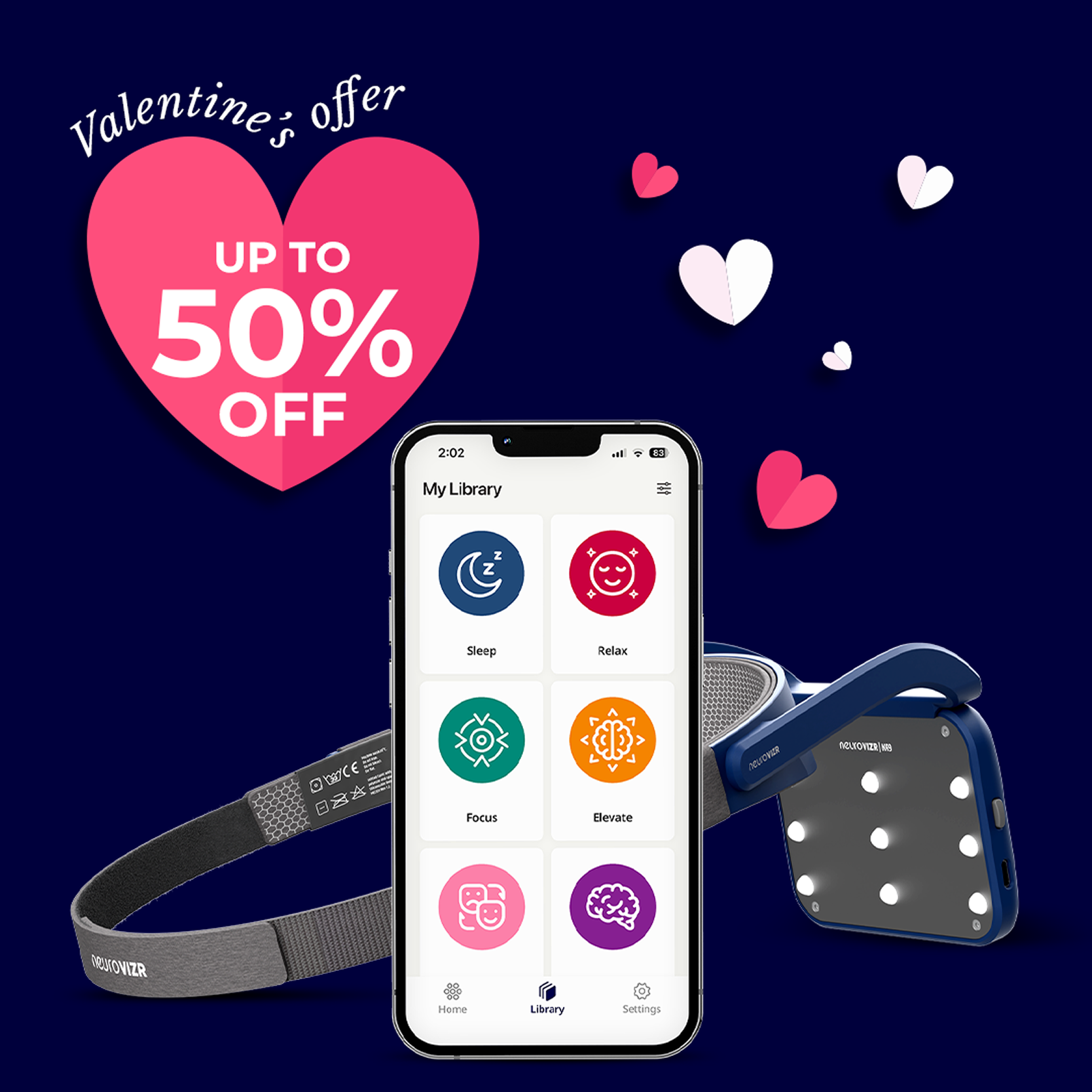 NeuroVIZR pairs light and sound in guided sessions designed to support relaxation, clarity, and everyday mental balance.